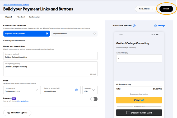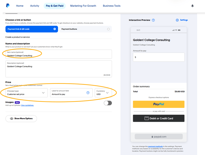 - Add your business name as the Item Name (optional) so that it is displayed on the payment page.