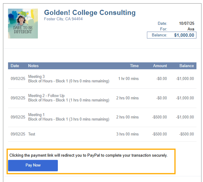 - If you add a PayPal link, it will display as clickable "Pay Now" button under the notes.