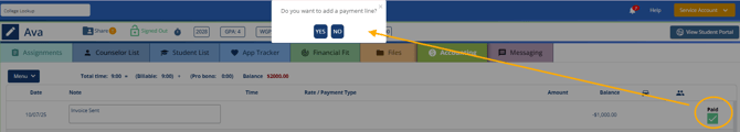 Once you do, CounselMore will ask if you'd like to add a payment line item.