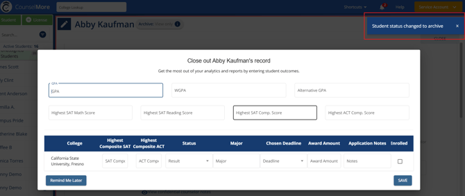 When a counselor archives a student in CounselMore, a pop-up appears prompting them to record or update the student’s record and admissions outcomes. This ensures that key details, such as application results and enrollment decisions, are accurately documented before the student is archived.
