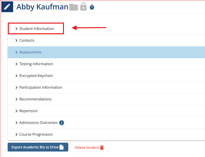 What is the Student Profile? Every student Record has Biographical information stored inside of it. You can get to a student profile by navigating to their Student record and clicking the pencil ("edit") icon next to their name. We use the student profile to create the Student's Academic Resume.