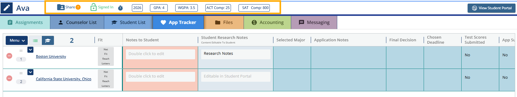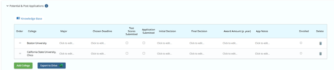 This Biographical Banner is labeled Potential and Post Applications because it is where the Counselor or Student can enter in previous application outcome information; it mirrors the App Tracker list. Counselors will record application outcome as results are coming in or will record application results post-season, in retrospect. Scenarios to consider: Some counselors find that the student will continue applying to schools after the Counselor believes the process is concluded. Some Counselors want to record their student's undergraduate results while preparing the student for graduate applications. While others still may want to enter results retrospectively for good record keeping.