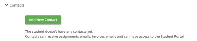 Contacts are any person's contact information you'd like to save under the student record. Contacts can be added at the time of adding student name, listed as (optional) and not mandatory to starting a student record. Parent / Sibling information is collected here and sharing fo Google Drive folders and Inviting to the portals are contained here.