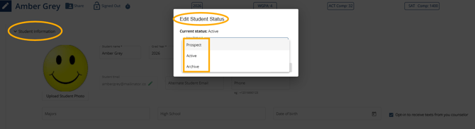 Expand the Student Information (topmost) section. Click the pencil to the right of the Status dropdown menu.