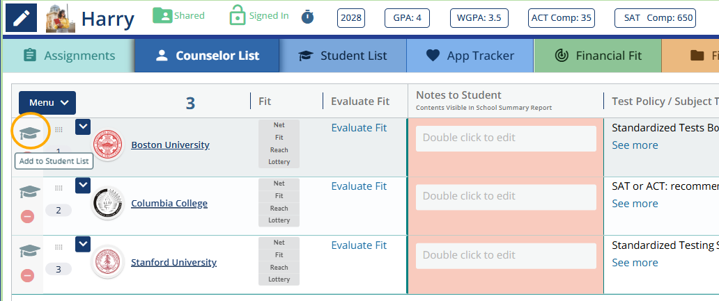 Your Counselor List holds the schools you selected in your Search. Evaluate them in greater detail before sharing with your student.