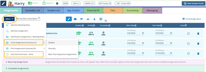 By moving away from traditional back-and-forth emails, Assignments facilitate an efficient service delivery process, drive student engagement that is focused on task completion (away from what if questions), track progress associated to calls to action assignments, and ensure alignment with their goals and the counselors ability to serve all student equitably, all within a cohesive and organized framework.