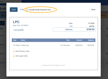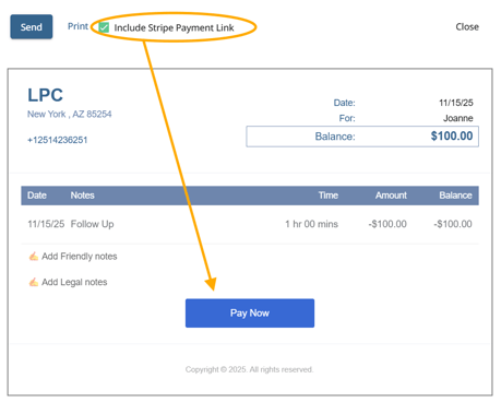 When this option is selected, a secure payment link generated by Stripe will appear in the invoice your client receives.