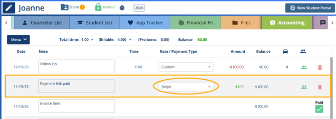 - A “Record Payment” line item is automatically added to the invoice to reflect the successful Stripe transaction.
