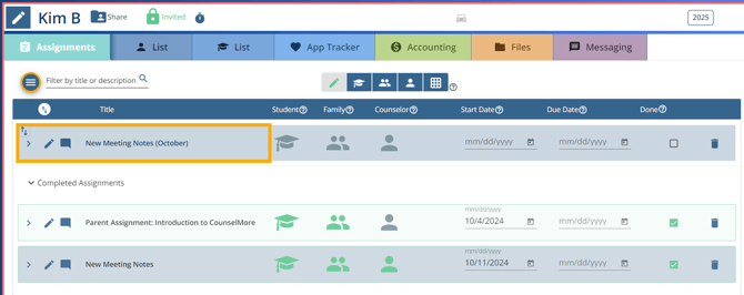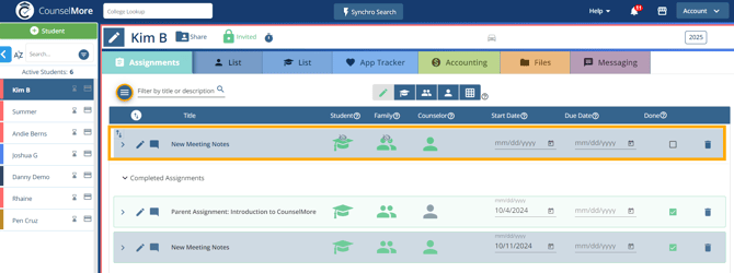 When a counselor assigns the same Routine Notes or Routine Assignments to a student multiple times, all of those meeting notes or assignments will appear in the students assignments tab.
