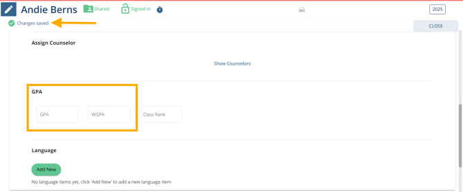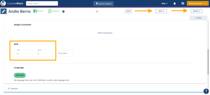 If you calculate multiple GPAs for a student, record each separately. You can add as many GPA types as you need — for instance, School GPA, Counselor-Calculated GPA, or Transcript GPA.