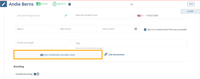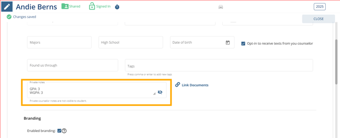 The Confidential Counselor Notes section is a secure place for counselors to store sensitive information like GPA or other details. By storing the GPA here, you retain the information for your records while keeping the student portal focused on what the student wants to see.