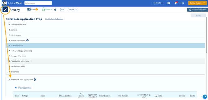 1. Click the pencil icon at the top left to access your Student Profile and select the Potential & Post Applications banner to expand it.