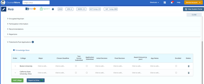 - From here you can set status and add major, chosen deadline, test scores submitted, application submitted, initial decision, final decision, award amount, app notes, enrolled.