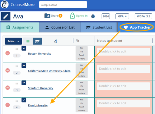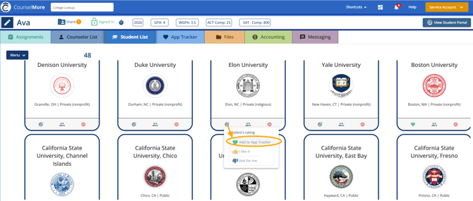- Selecting "Add College" will include the college in all three lists: Counselor List, Student List, and App Tracker.