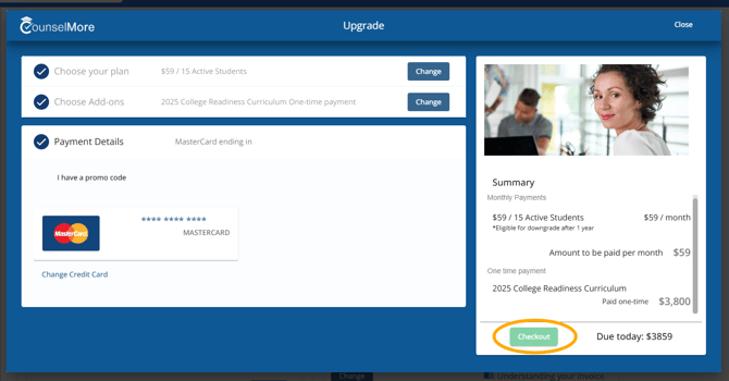 You’ll be asked to enter your estimated number of active students, and the system will automatically highlight the plan that best fits your needs. Next, click “Buy Now” on your chosen plan.