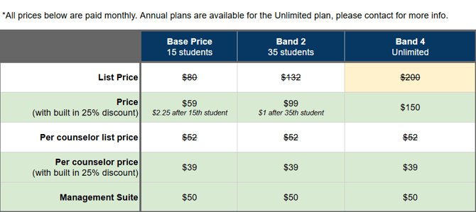 How much does CounselMore cost? Free Trial Free Onboarding Free Access to Professional Community Choose a plan by the number of students, add more anytime Invite co-workers to any plan Discounts already included