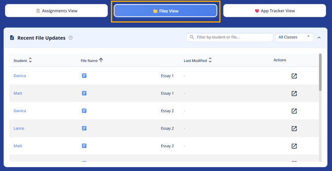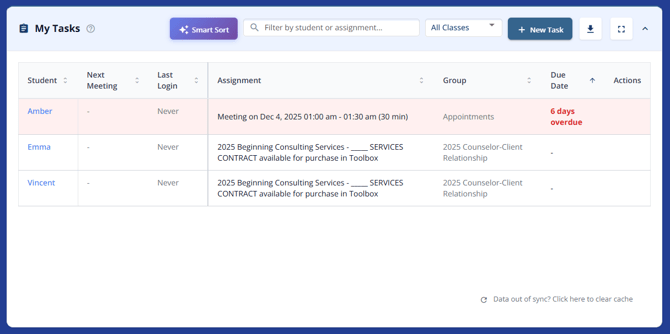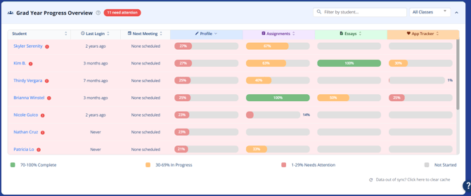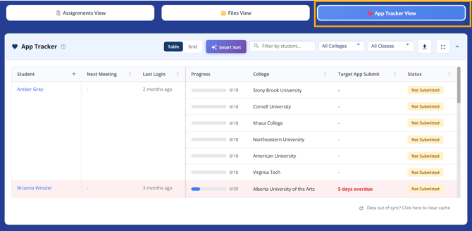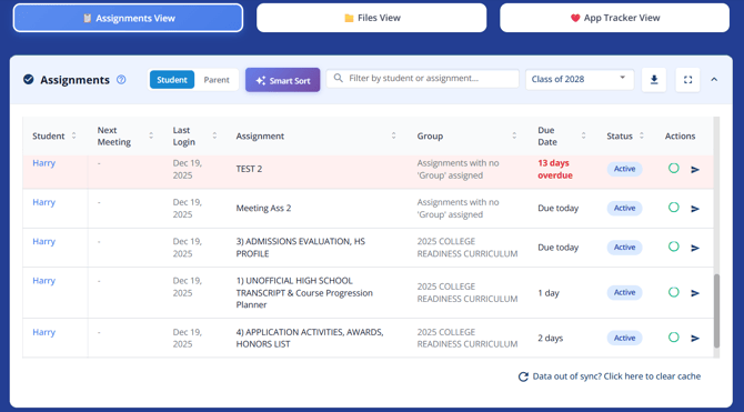 Summary of the Assignments tab across all of your students. Track student and parent facing assignments like essays and application components. Use Smart Sort to identify students who need follow-up. Identify students that haven't logged in and have assignments due soon and send a reminder email.