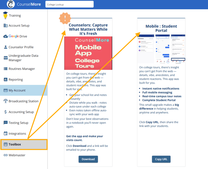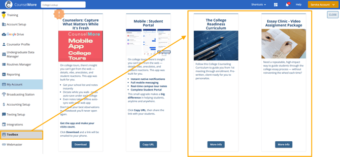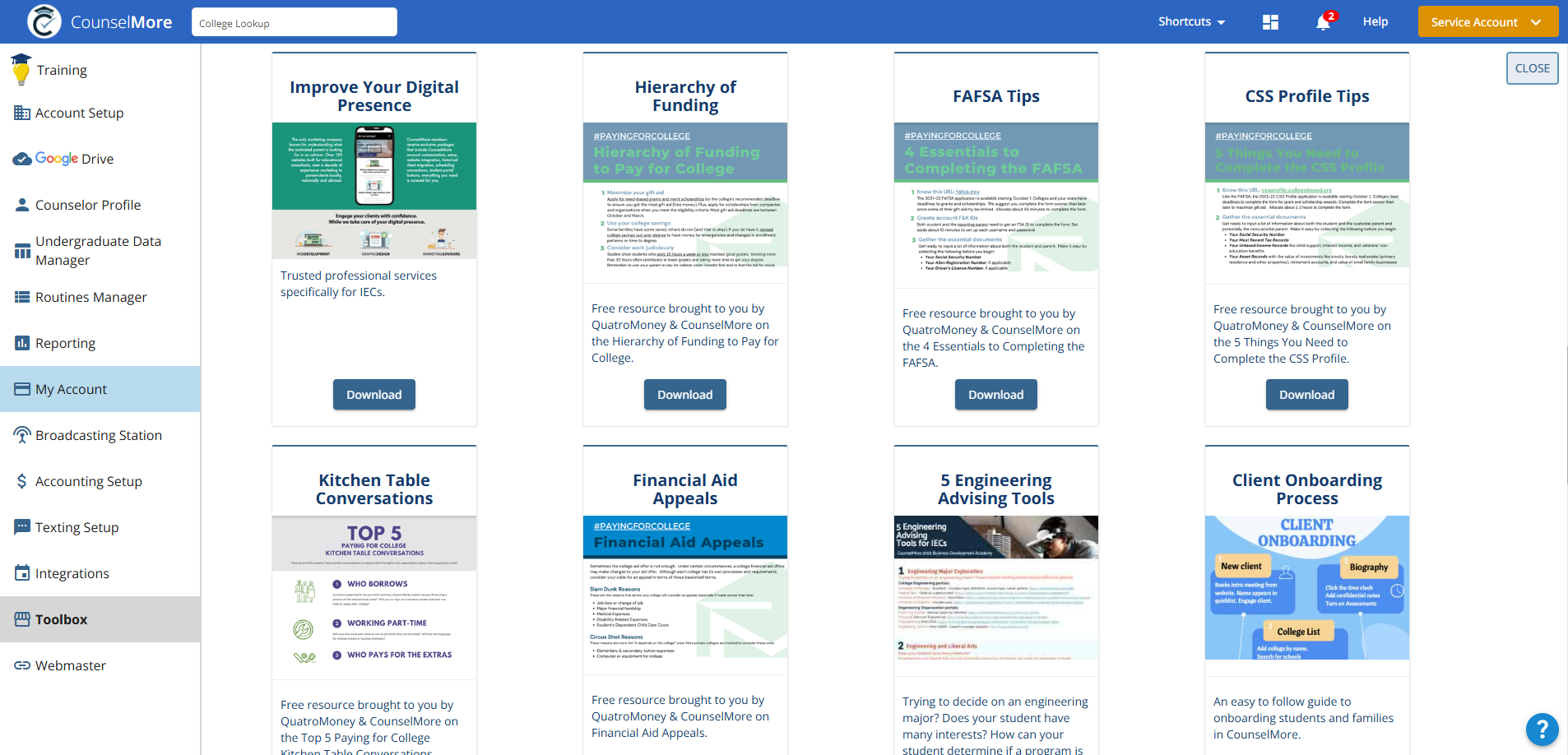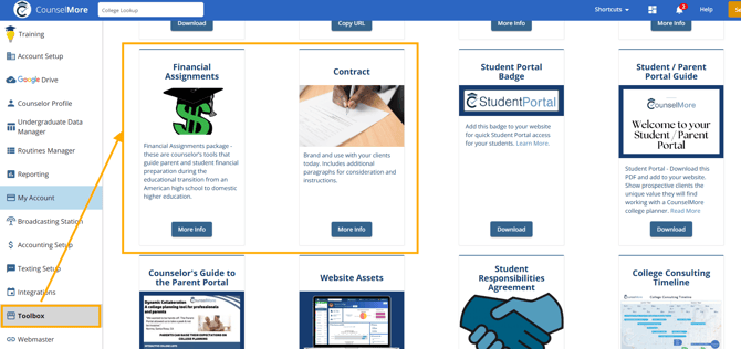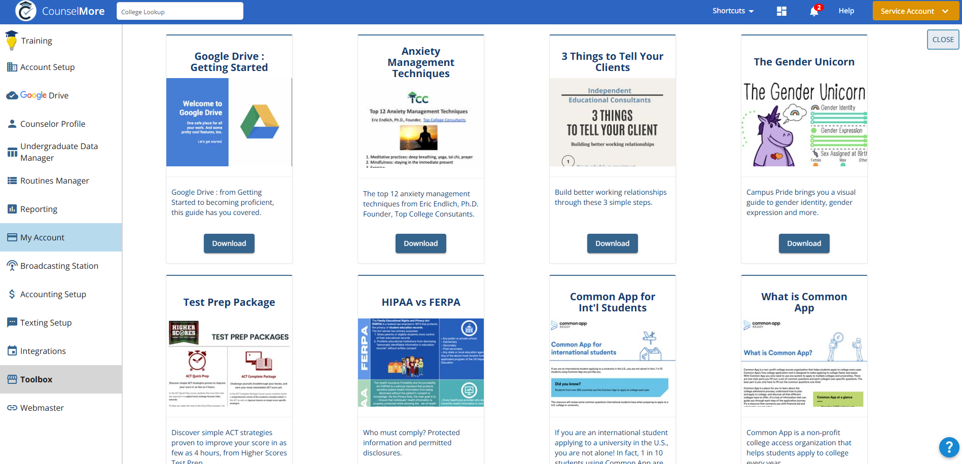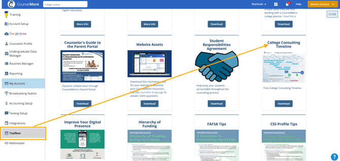 The Toolbox is a collection of tools, downloads, and resources designed to help counselors and students. Think of it as a one-stop hub for everything you might need to run your counseling practice efficiently and provide students with helpful materials.