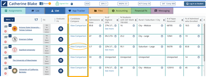 For a comparative analysis, the Candidate Compare column allows counselors and students to evaluate how a student’s academic profile aligns with a school’s requirements. This report includes:
