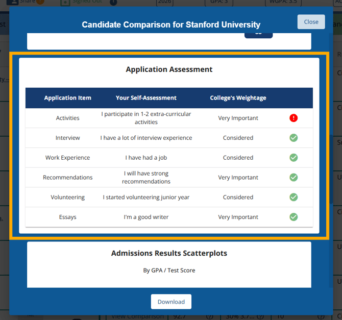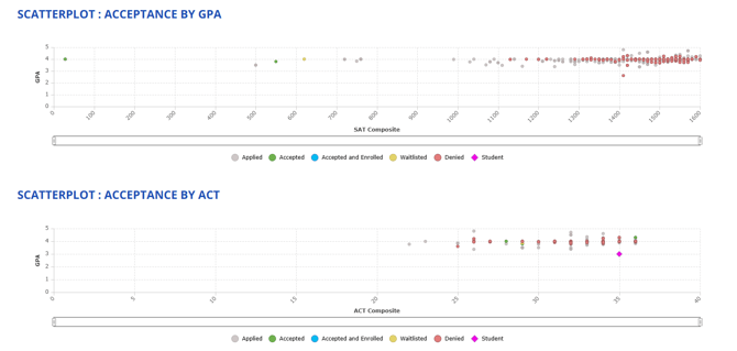 • Admission Results Scatterplots: A visual representation of past admissions results based on GPA and test scores, helping predict the likelihood of acceptance.