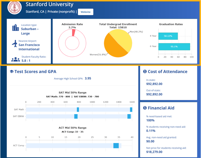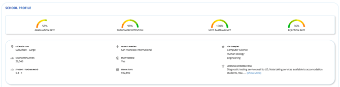 The School Report provides an in-depth look at an institution’s key attributes. To access this report, click on the school name or use College Lookup where you’ll find a breakdown of: