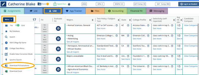 To download a student's Evaluate Fit report: