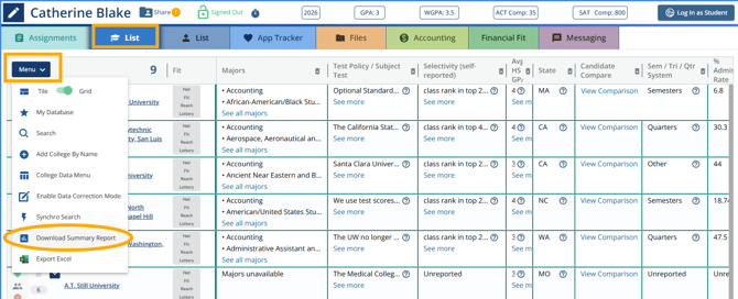 Student List > Menu > Summary Report of schools on list