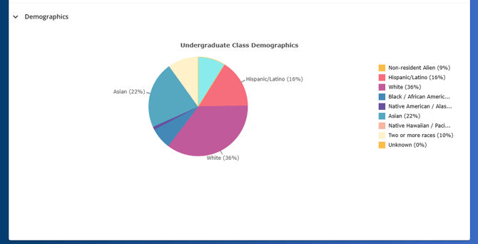 • Demographics: Breakdown of student population by various factors, including ethnicity and geographic distribution.
