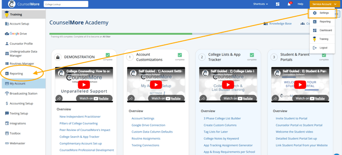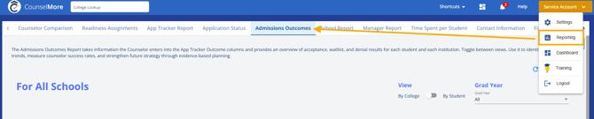 2. From Service Account → Settings → Reporting → Admissions Outcomes