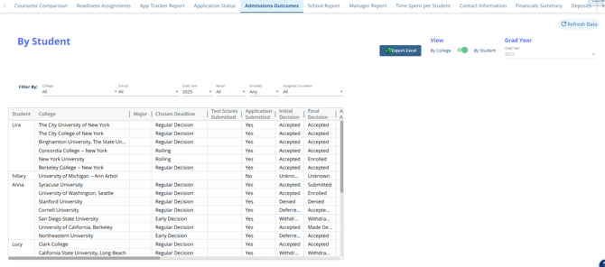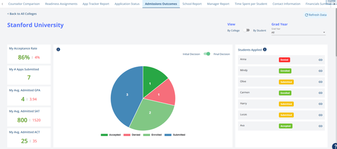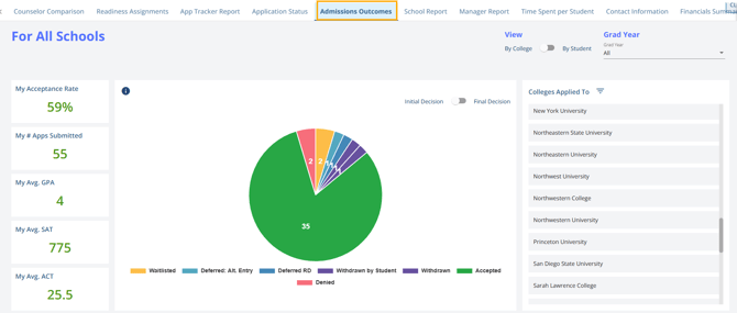 The Admissions Outcomes Report helps visualize and analyze college application data across all students.