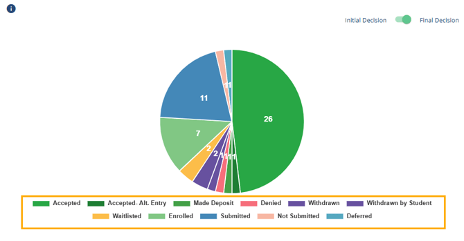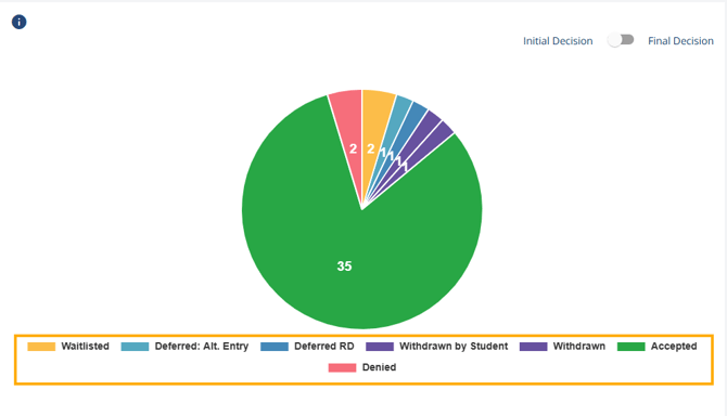 Each decision category is color-coded to match statuses in the App Tracker (e.g., Accepted, Waitlisted, Deferred, Withdrawn, Denied).
