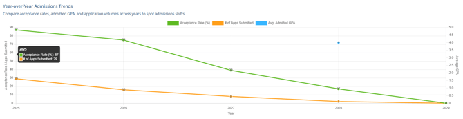 This visualization helps identify shifts or patterns in student application outcomes and academic performance over time.