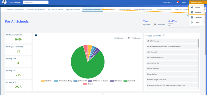 - Service Account → Settings → Reporting → Admissions Outcomes