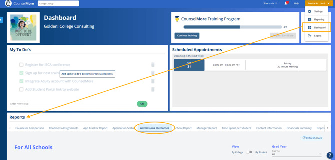 - Go to Service Account → Reporting → Admissions Outcomes, or